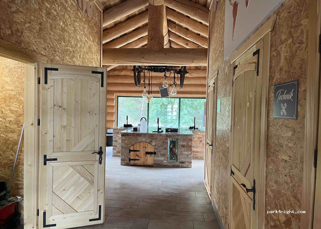 een super mooie plek het sanitairgebouw, receptie en restaurant gemaakt van boomstammen