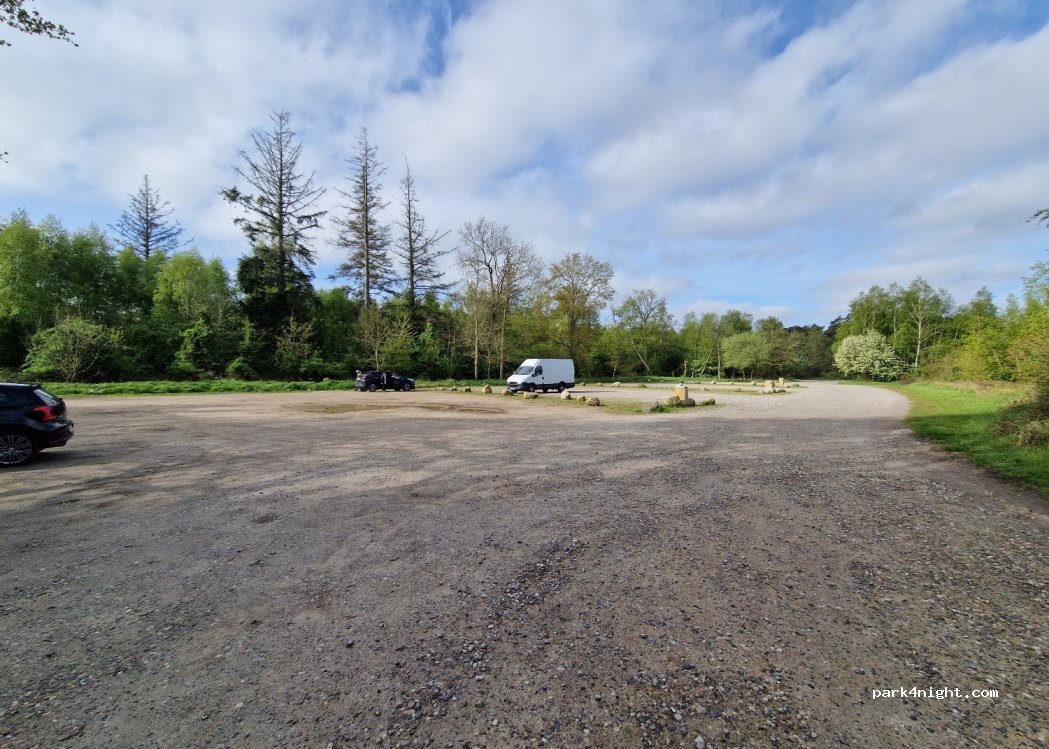 Ampio parcheggio sterrato all'ingresso della foresta di Bøto. Blocco servizi aperto dalle 7 alle 20.