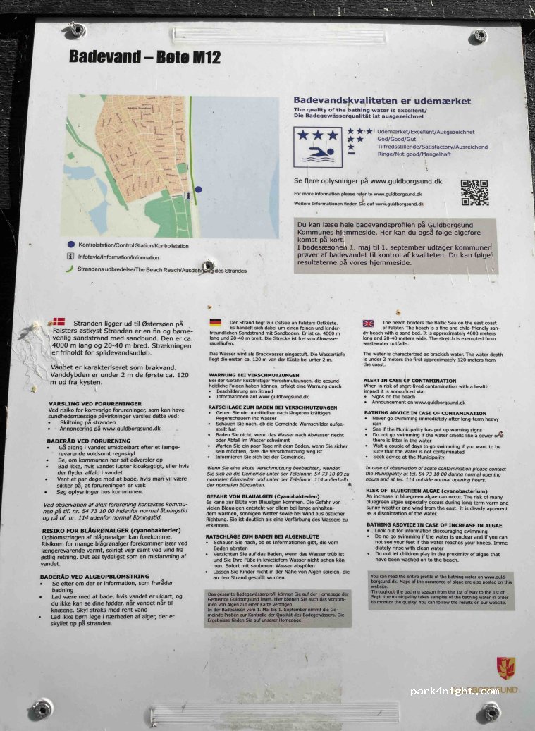 Great place if you come with a late ferry. Clean toilets, tidy all around, bring your mobile at night to open the doors. Right next to the beach - make sure to keep your dog on the leash, since that is mandatory in Denmark. Really quiet at night, during the day lots of day visitors, keep in mind this is not a camping place, so please behave accordingly.