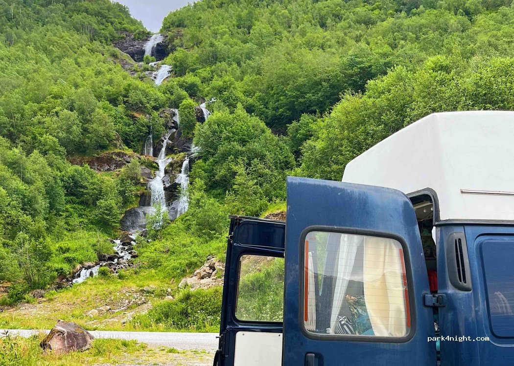 Wunderschöner Spot direkt unterhalb eines Wasserfall und am Fjord. Die Zufahrtsstraße ist schmal aber gut machbar.