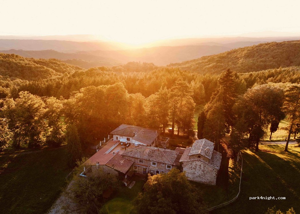 A magical setting of an old farmhouse connected to a church, with nice fields for the dogs to play. It's slightly off-path for other sights of Tuscany, with a coule of km of gravel road to the villa. We stayed one night and didn't regret it. Facilities are basic but clean. Four stars as the pitches could be nicer - now just on the parking lot next to other day guests. Nice restaurant (ca 50€pp)