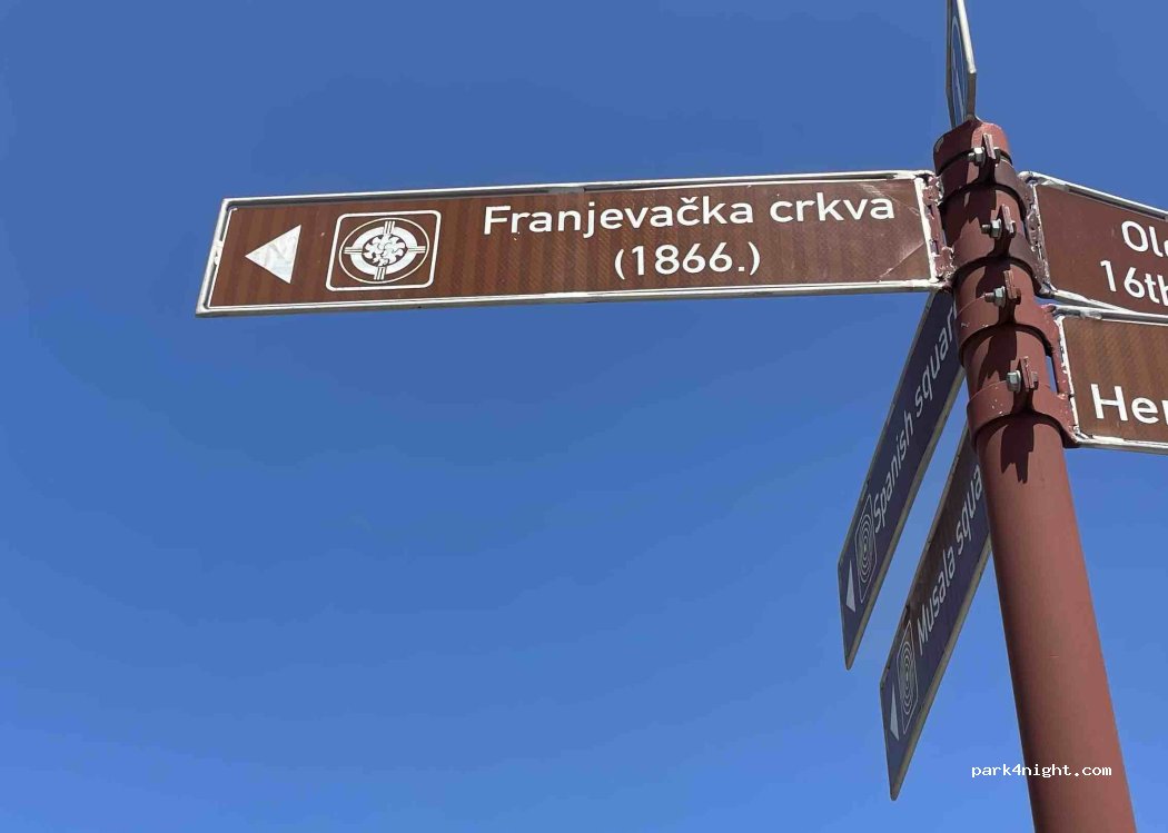 Well situated, guarded parking lot at the Peace Belt Tower. Access from Franjevacka st. Historical center 500 meters away. Bit noisy, No facilities, but lots of space. We stayed here a day, including night, paid 20KM Need to contact, pay at staff at Bar Campanile upon arrival. Open from 7am to 22pm, closed for the night, but you can still enter by foot through a passageway at the back of the lot.