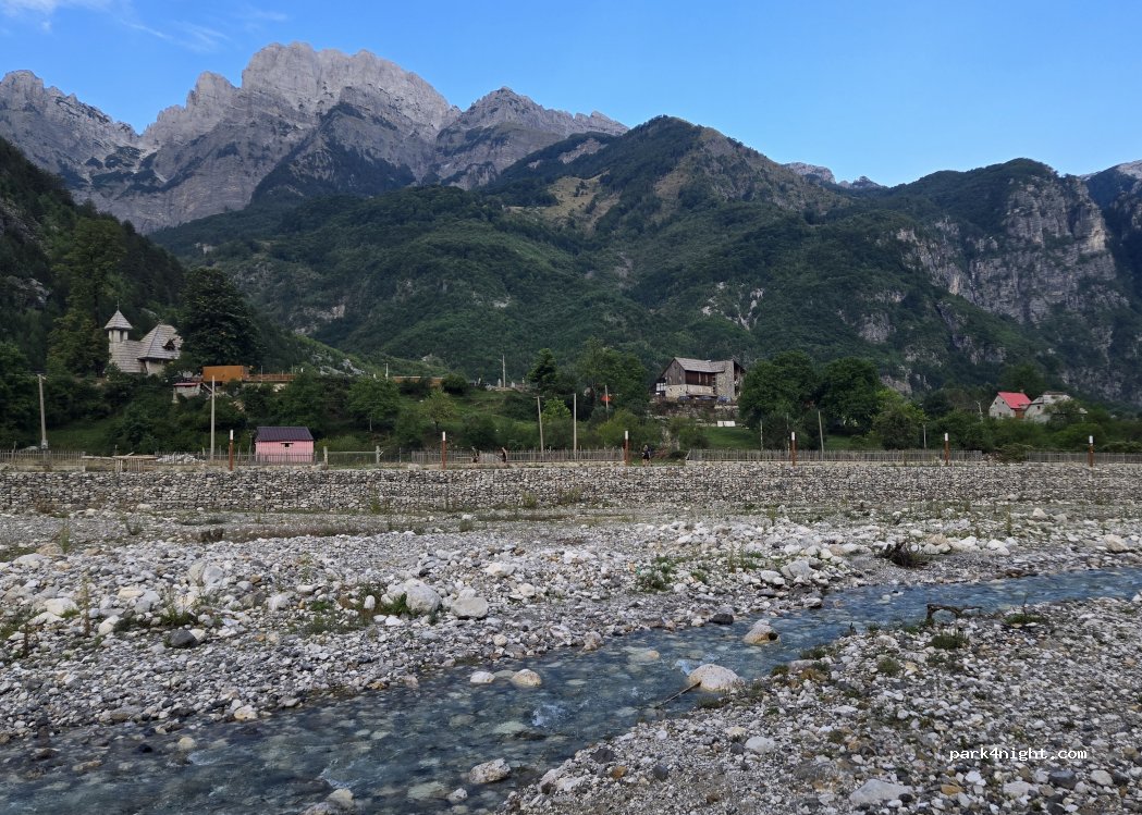Dieser Stellplatz ist wunderschön und direkt am Fluss umgeben von Pienienbäumen. Bietet auch Schatten. Wunderschönes Panorama mitten in den Bergen gegenüber vom Ort Theth. Hinfahrt durchs Wasser mit einem hohen Auto möglich sonst befindet sich am Anfang des Ortes eine Brücke die man überqueren kann. Ein Schotterweg führt dann direkt zum Platz.