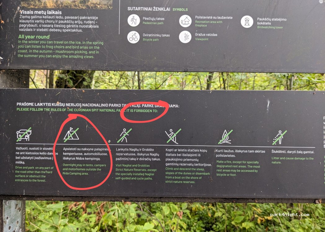 The National Park regulations (see photo) are clear: no overnight stays in vehicles are permitted outside the Nida campground.