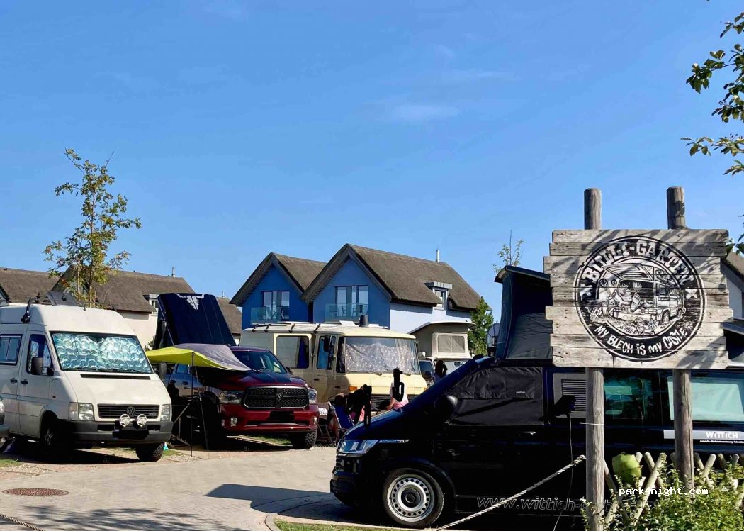Ein Stellplatz für 11 Fahrzeuge (max. 6m laut Homepage des Hotels „Bretterbude“), 20 Meter zum Strandzugang. Sehr nettes Personal.