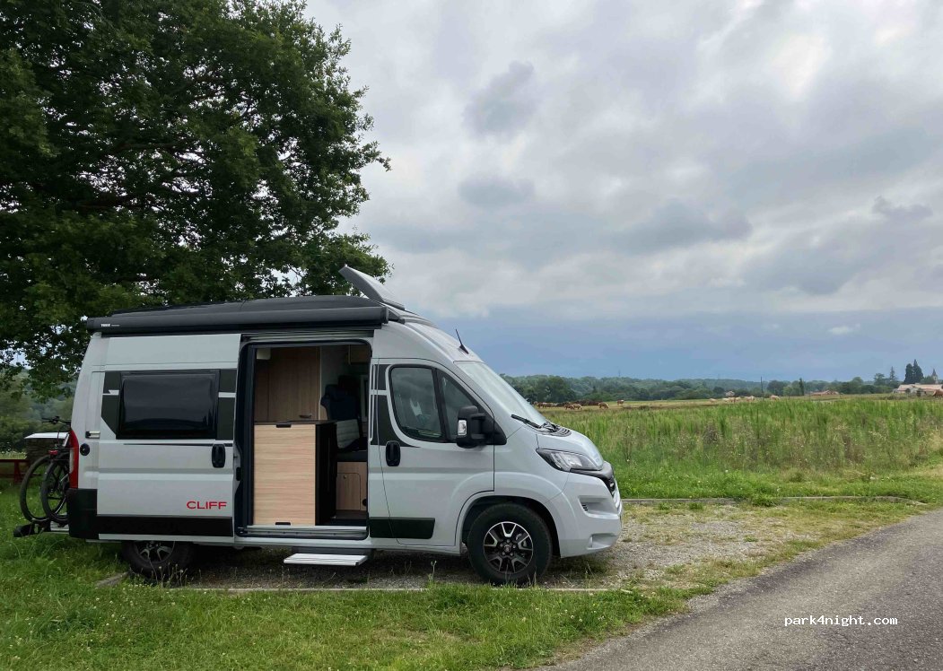 Pitches in the middle of the fields. Possibility to park a CC of 7.50 m and a shorter one. Very calm place.