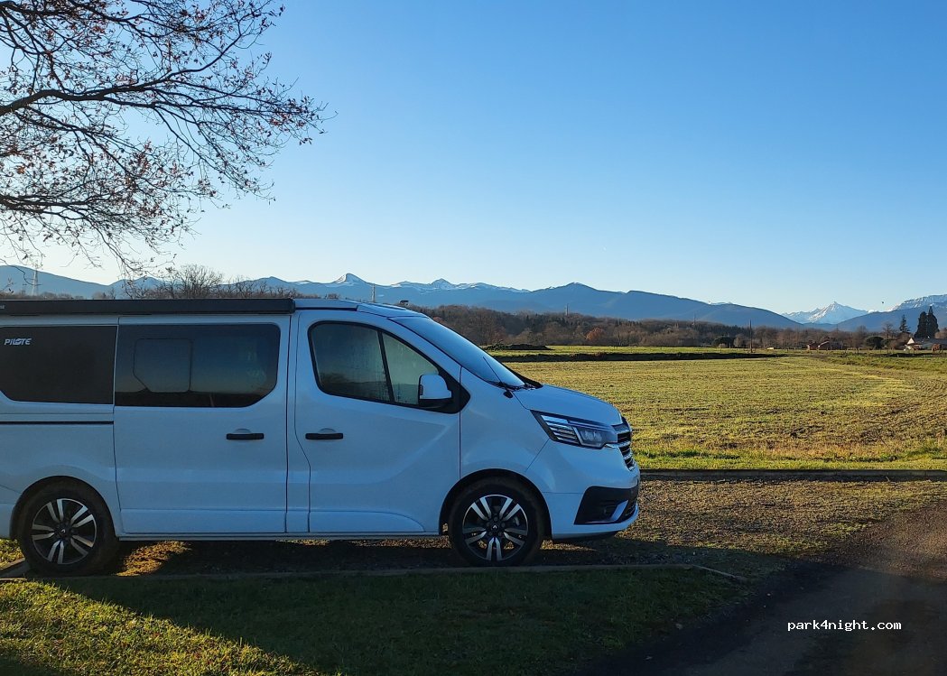 magnifique emplacement sur une petite route de campagne. 3 emplacements pour petit véhicule type van, pas possible pour camping car. une table de picnique. vue magnifique sur les Pyrénées et sur un près avec des chevaux. très calme route avec peu de passage.