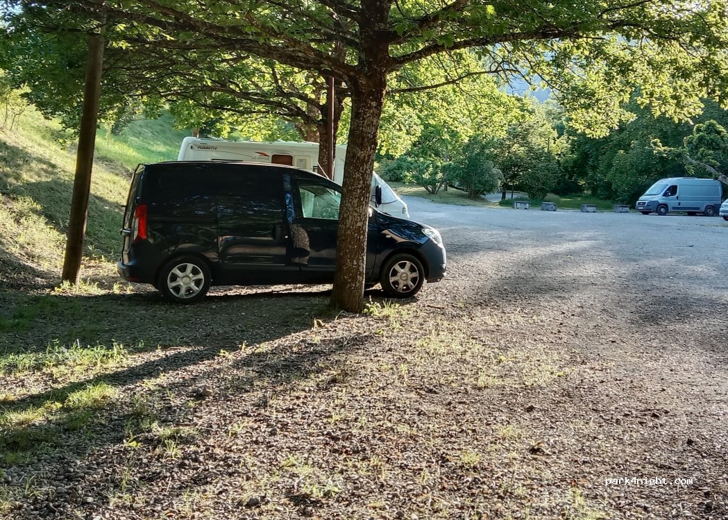 parking du village a côté de la salle des fête mais tres calme. possibilité de rester 24 h maxi pour camping car ou van. nous y avons avons passer notre première nuit et impeccable, coin ombragé. village très sympa. poubelle et eau à disposition. impeccable pour une halte. je recommande vivement