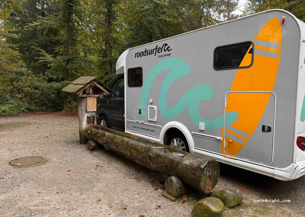 Très bel endroit. Calme car il n'y a pas de route aux alentours. Quelques marcheurs dans la forêt. Il n'y avait personne le soir ou nous avons dormi. Petite fontaine à eau foyer pour barbecue, poubelles et tables de pique-nique. Parking plat.