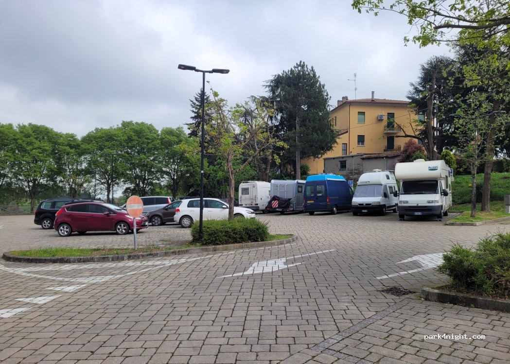 4 piazzole ufficiali riservate ai camper a 300m da La Rocca e dal paese di Dozza. Parcheggio molto tranquillo per il giorno ma anche per la notte. Elettricità a pagamento, fontanella per acqua, bagno pubblico automatico a gettone. Cartello con su scritto: MASSIMO 48H, DIVIETO DI CAMPEGGIO.