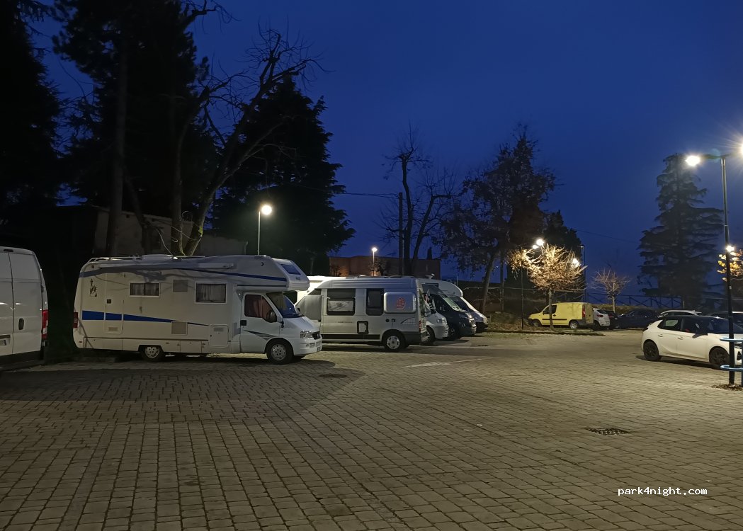 Parcheggio ampio dove ci stanno sia auto che camper. Strada vicina ma poco trafficata. Siamo una decina di camper a passare la notte, penso e spero non ci siano problemi, non ho visto le colonnine per l'elettricità, ma se c'è scritto che ci sono, ci saranno