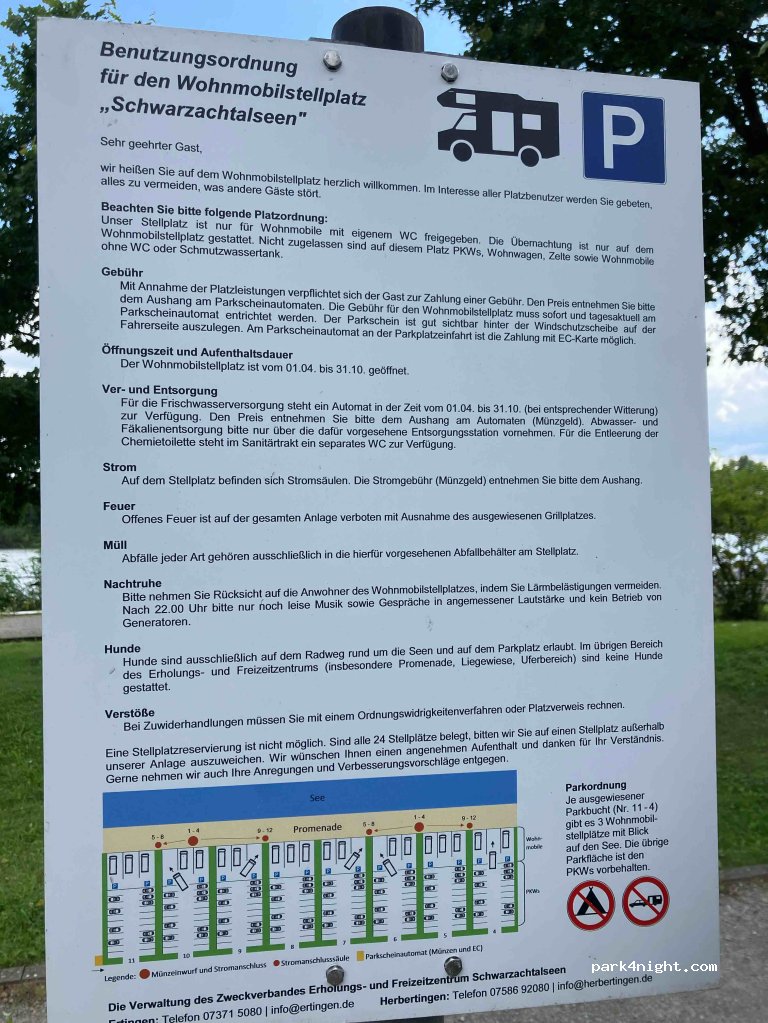 Geschotterte Stellplätze direkt am See und der Promenade gelegen. Zufahrt problemlos. Stellplatzgebür 14 Euro für 24 Std (wird auch kontrolliert). Strom für 50 Cent/KWh. Frischwasser gibts umsonst. Entsorgungsmöglichkeit ebenfalls vorhanden. Duschen am Badesee möglich, Toiletten befinden sich am Restaurant. Allerdings sind diese später am Abend, nachdem das Restaurant schließt, unbeleuchtet.