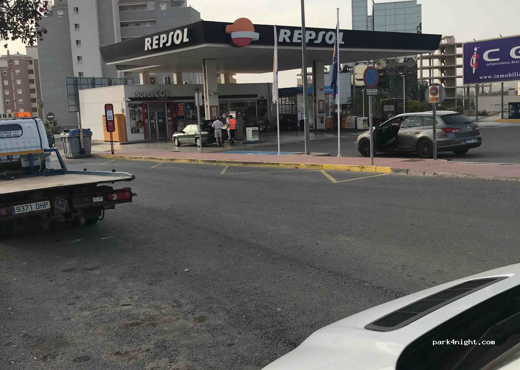 Amplia zona de aparcamiento en línea en una calle lateral al lado de la gasolinera. Ligeramente en pendiente. Se puede aparcar día y noche, bastante tráfico, pero lugar iluminado. Hemos pernoctado aquí sin problemas. En la gasolinera hay lavandería. Tienen GLP y AdBlue. Cerca hay comercios y el centro del pueblo está a un km.