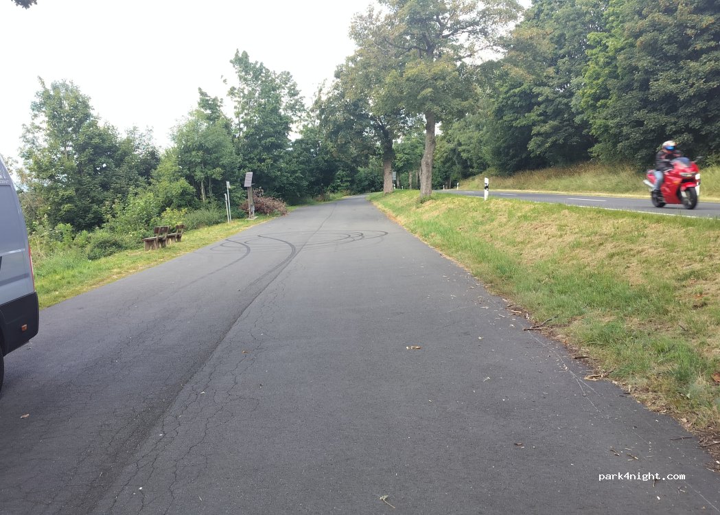 Fantastische Aussicht über den Vogelsberg bis nach Frankfurt. Direkt an der Straße, aber die ist nachts wenig befahren. Für eine Nacht ein schöner Platz. Mit kleinen Fahrzeugen könnte man auch unterhalb in einem Feldweg stehen.