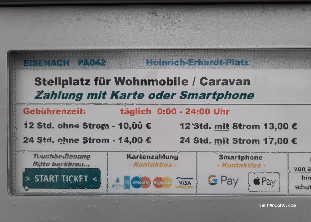 Die Stadt hat Stromverteilkästen aufgestellt, der Strom ist inklusive im Parkpreis. Sehr schöner Blick auf die 2km entfernte Wartburg, Innenstadt und viele Restaurants fussläufig in wenigen hundert Metern. Innenstädtisch ruhig.