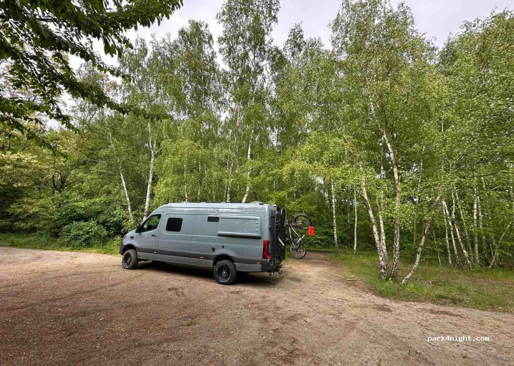 Schöner, kleiner Parkplatz mitten in der Natur (Platz für maximal drei größere Vans) ab und zu kommen Autos vorbeigefahren, aber man ist durch die Bäume geschützt. Der See ist nur 100 m entfernt. Keine Mülleimer vorhanden, aber der Platz war sehr sauber. Weiter so, dann wird aus dieser Idylle kein Verbot ☺️