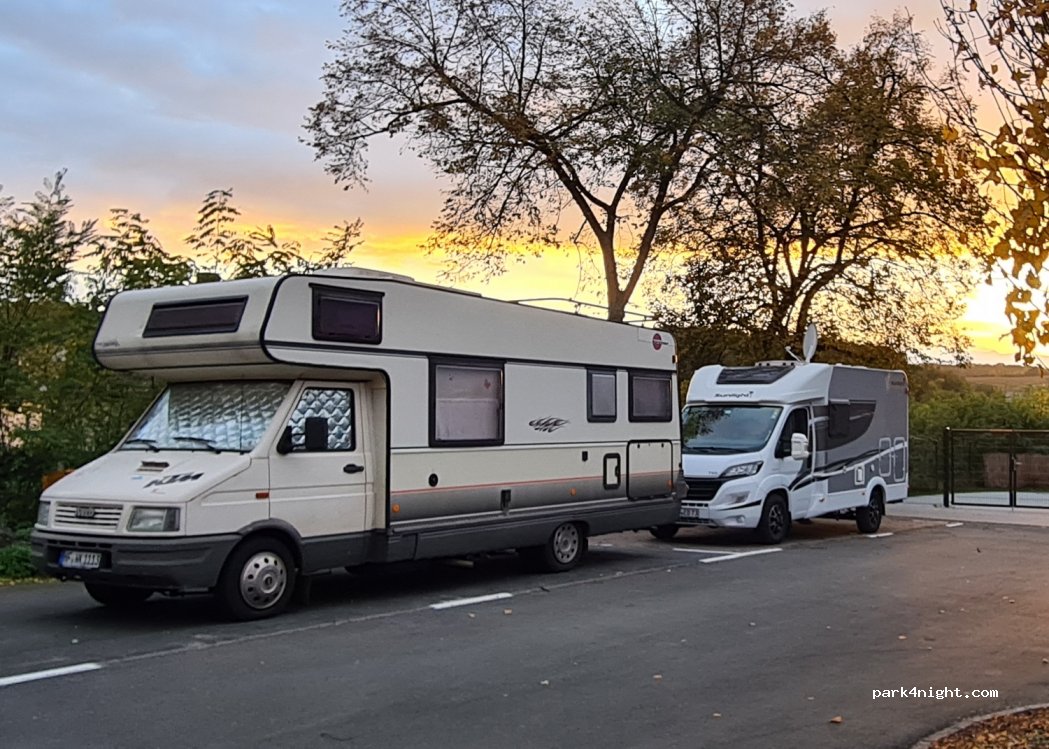 Quiet place for two vans with fresh water and electric available on request via website but I did not use this feature. The sign says that it is possible to use a drain to dispose of grey water but again I did not use. Head to the left of the school to find a steep set of stairs that go directly down to the town. REWE supermarket has Local produce such as wine and rhubarb cordial.