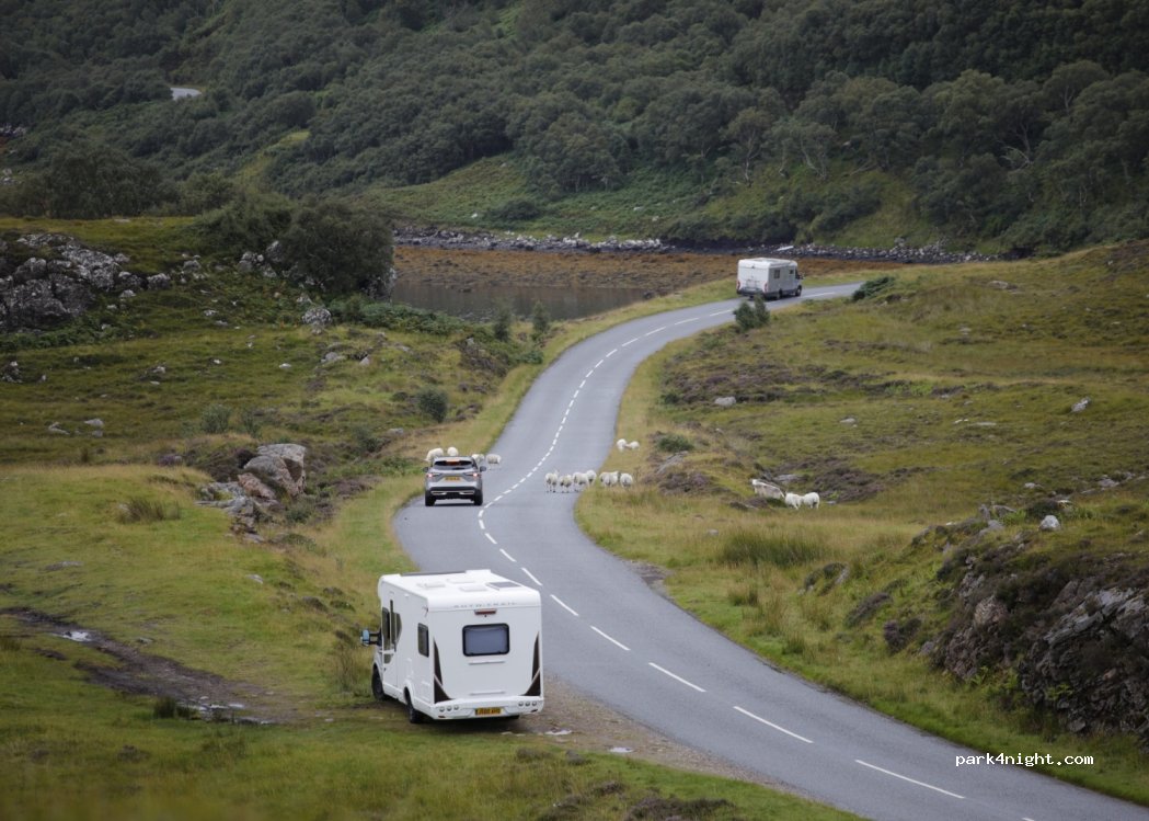 Jolie vue. Ne pas stationner sur l'herbe, rester sur les cailloux, près de la route,pas de circulation la nuit (même en août). Pour 2 vans ou 1 camping-car. Partie herbeuse boueuse, attention. Marche vers la pointe de terre au dessus donne une super vue de la baie, de Torridon, de Sheildaig et des montagnes. Compter 1h30 A/R, chaussez vous correctement, boueux! ( enfin bon, on est en Écosse)