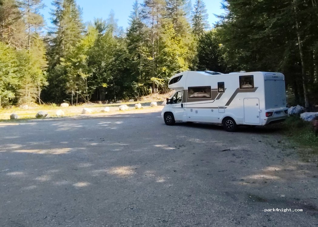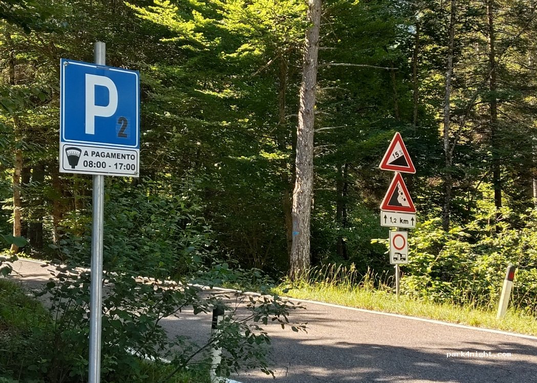 Only parking (Lavacel) allowed for campers 1 km from Lake Tovel reachable along the road (all uphill 15%), from a path in the woods (steep sections, not recommended for strollers) or with the paid shuttle that passes every 20 min from 9 to 19. No service, cost per day (in summer) to be paid at the "park" entrance or online from a specific website or to the attendant in the morning when he passes by. Attention the road in the last part is narrow. On the way out it is good to wait at the first parking lot for a bus to depart (in their time slot) and queue up, ditto on the way back. There are not many places and during the day they are also occupied by cars.