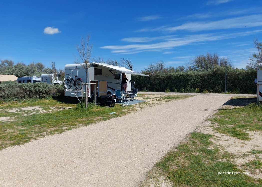 Campeggio con tutti servizi per camper. poca ombra, piazzole ampie e pianeggianti. Animali accettati. Ampia piscina. Mare a 2 passi. Bella la pista ciclabile per vedere i fenicotteri rosa. Bagni da rifare. Pulizia scarsa