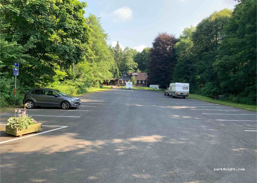 Parking lot on the edge of the forest outside the village with plenty of space, tarred and level. Very quiet in the evenings. Normally busy during the day on weekends. Ideal starting point for hikes. Bakery, village shop and restaurants approx. 1.5km. Irlenhof farm shop 1km. Zitzenbach natural outdoor pool (highly recommended) approx. 1.8km away, 20min walk. Supply and disposal of RV parking space Kreuztal approx. 3.5km free.