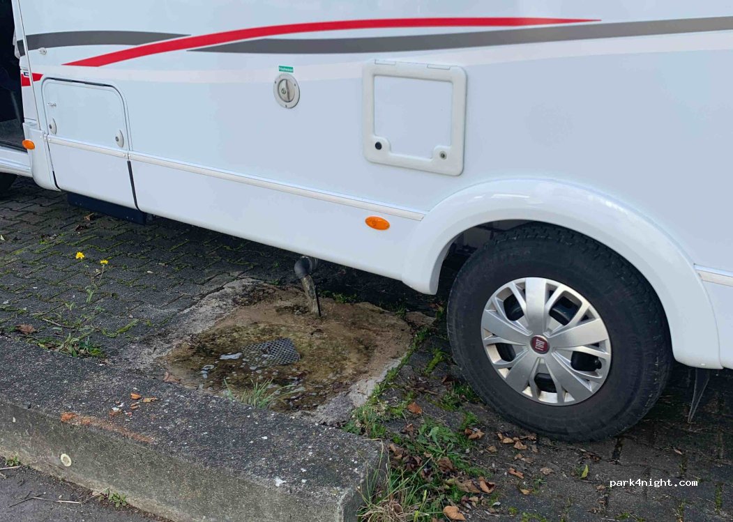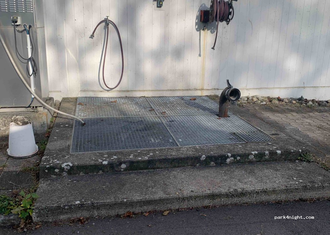 An der Pforte melden, dann auf das Gelände fahren bis zum hinteren weißen Gebäude. Dahinter gibt es Recht vom Weg eine Stelle zum ablassen des Grauwassers.