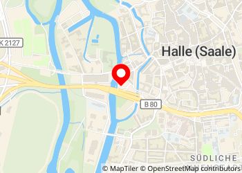 A la Stadtschleuse 1 parking simple sur la Saale en bordure de la vieille ville de Halle ; asphalté; illuminé; libre; Tram à proximité ; relativement bruyant car la rue principale à côté