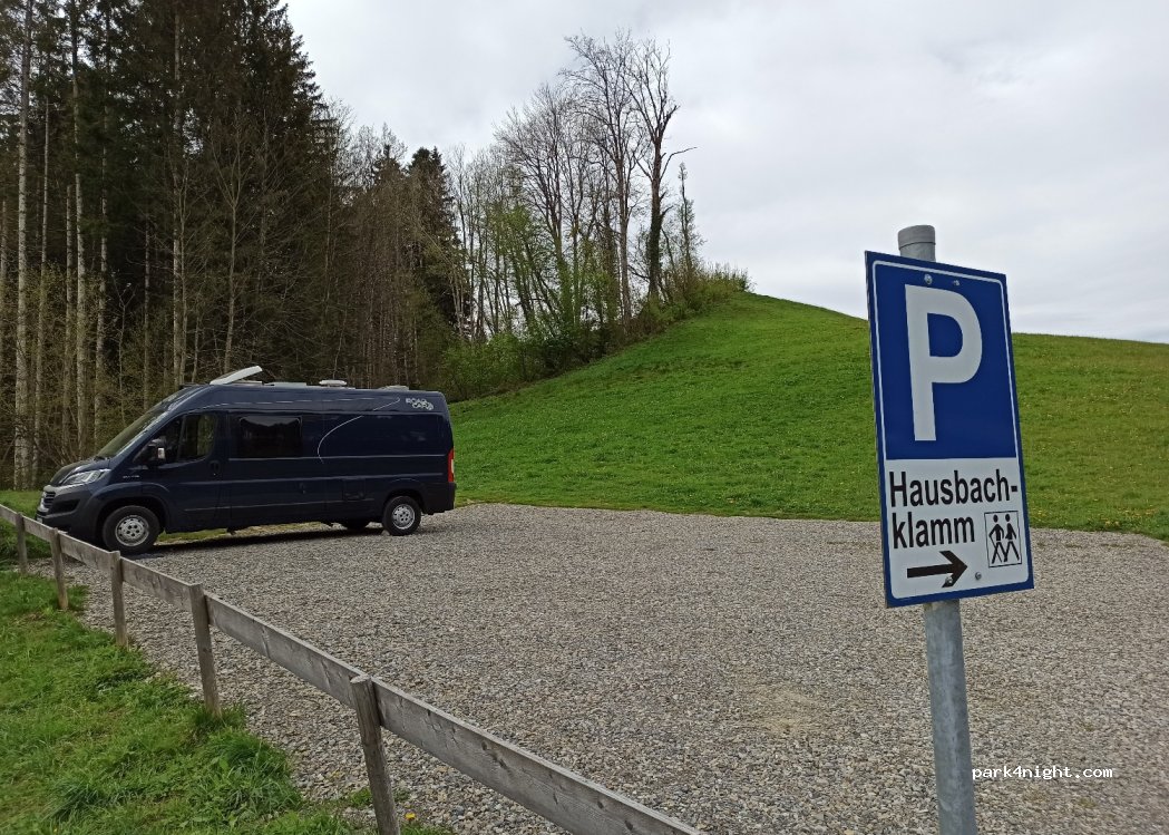 Schöner, ruhiger Platz zum Übernachten. Der geschotterte Teil ist leider schräg, aber oben auf dem Wiesenstück steht man an einer Stelle gerade. Der Platz ist als "Wanderparkplatz Hausbachklamm" ausgeschildert und in Maps zu finden.