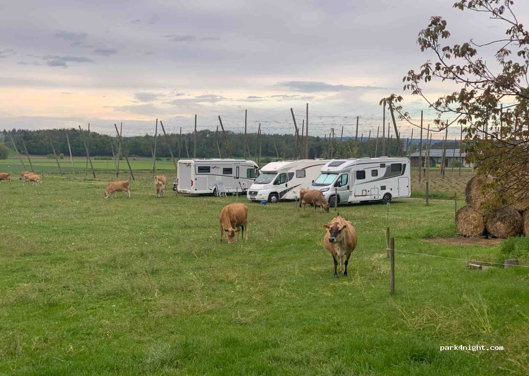 Emplacements privés dans une ferme familiale gérée avec amour, avec boutique. Terrasse couverte, toilettes et douche à disposition. Un lave-vaisselle est en construction. Veuillez nous appeler pour réserver. Nous acceptons uniquement les eaux grises. Pas de vidange des toilettes.