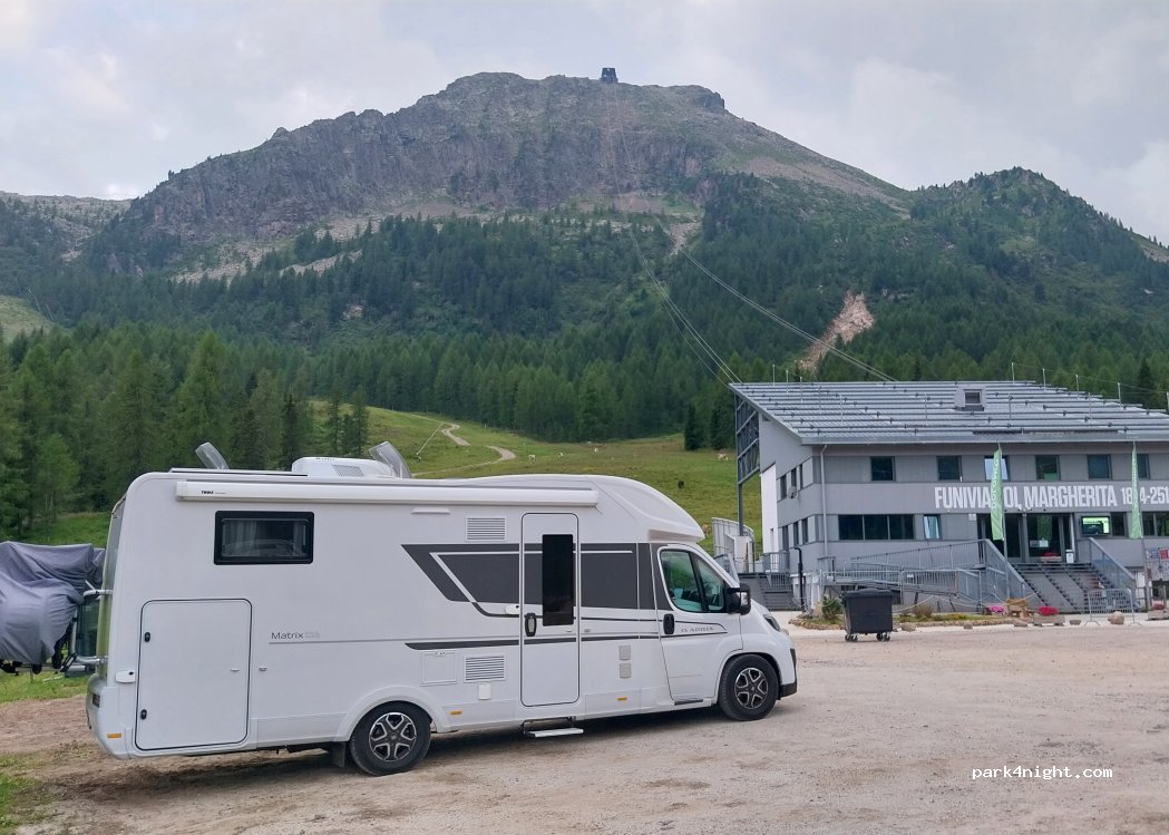 Parking de l'ascenseur allant au Col Margherita. Stationnement gratuit aussi longtemps que vous le souhaitez. J'y ai passé deux nuits sans aucun problème. Les locaux utilisent également ce parking pour que vous ne soyez pas le seul. La route principale est très proche mais très calme pendant la nuit. Endroit idéal pour parcourir les sentiers autour de cette région.
