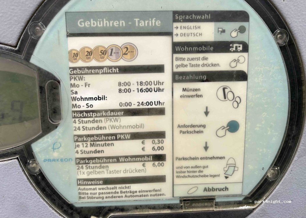 Parkplatz ohne V/E - 6.00 €/24 h am Automat oder per Easypark-App. Die Nacht war sehr ruhig. Bäckerei in ca. 5min ab 5:30 Uhr geöffnet. Gut für eine Übernachtung.