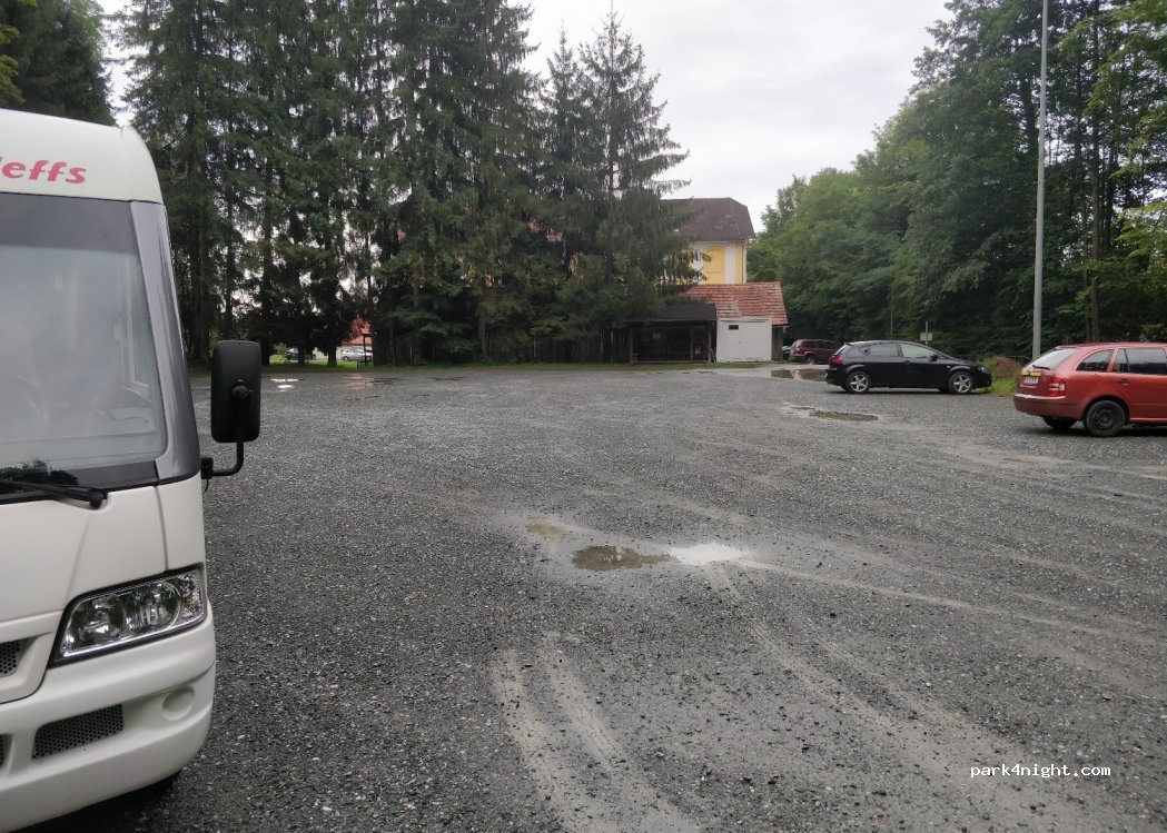 Parking à la Deutschlandsberger Klause. Parking plat et gravillonné. Calme, léger ruissellement du ruisseau. Partiellement ombragé.
