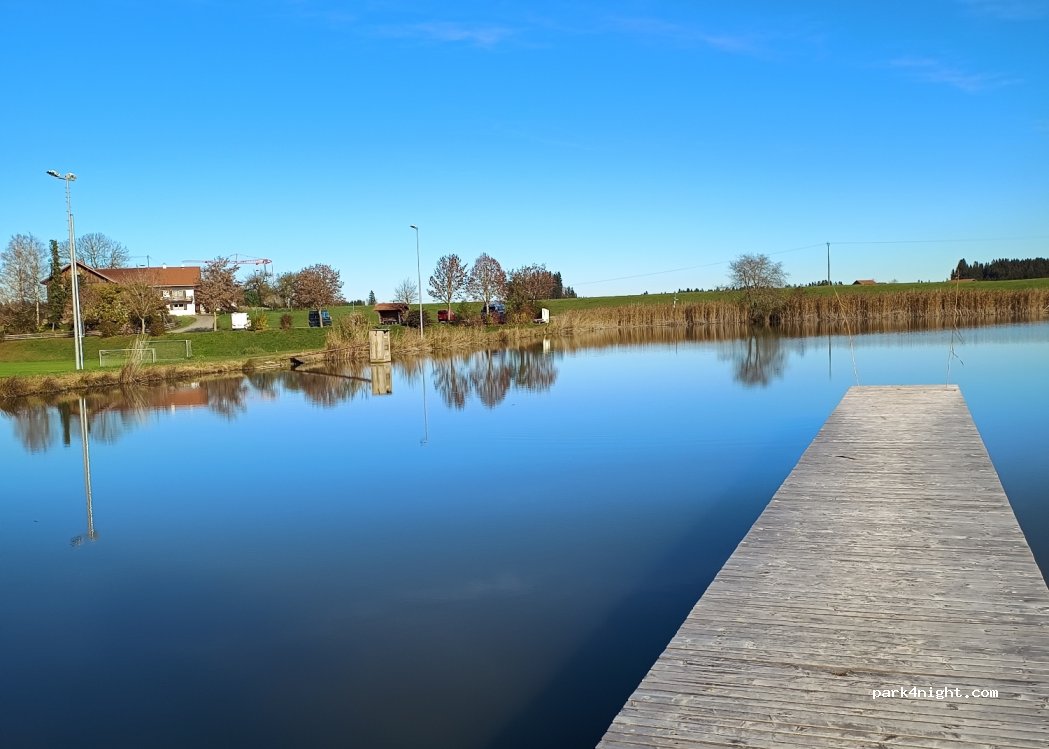 Der Platz liegt auf einer kleinen Anhöhe an der Stirnseite des Fußballplatzes. Vom Platz aus hat man einen herrlichen Blick über das Dorf und in Richtung der Alpen. Wiesen und Weiden beginnen direkt beim Stellplatz. Wenige Meter weiter ist auch ein kleiner Badeweiher mit einem Spielplatz. Ansonsten steht man auf dem Platz mehr oder weniger mitten in der Natur.