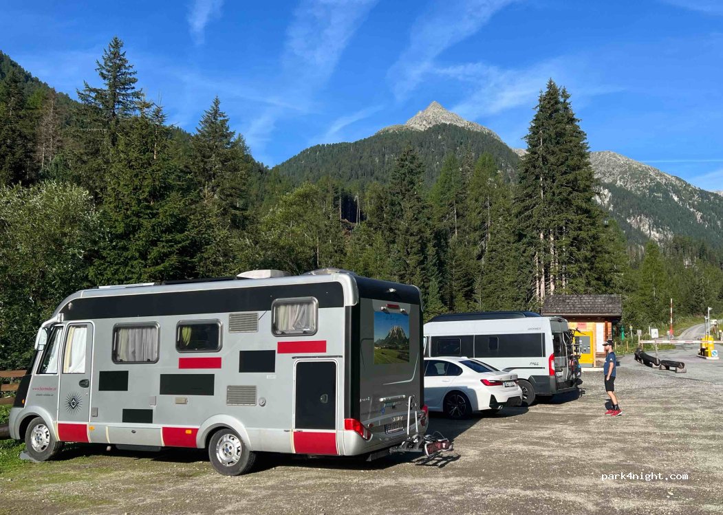 Sono rimasto una notte e un giorno con un altro camper, pagando regolarmente il parcheggio, ma alla sera l'addetto al sistema di pagamento è venuto a dirmi che non potevo stare di notte, anche se non c'è un cartello, perché è vietato in tutto il Tirolo al di fuori del campeggi.