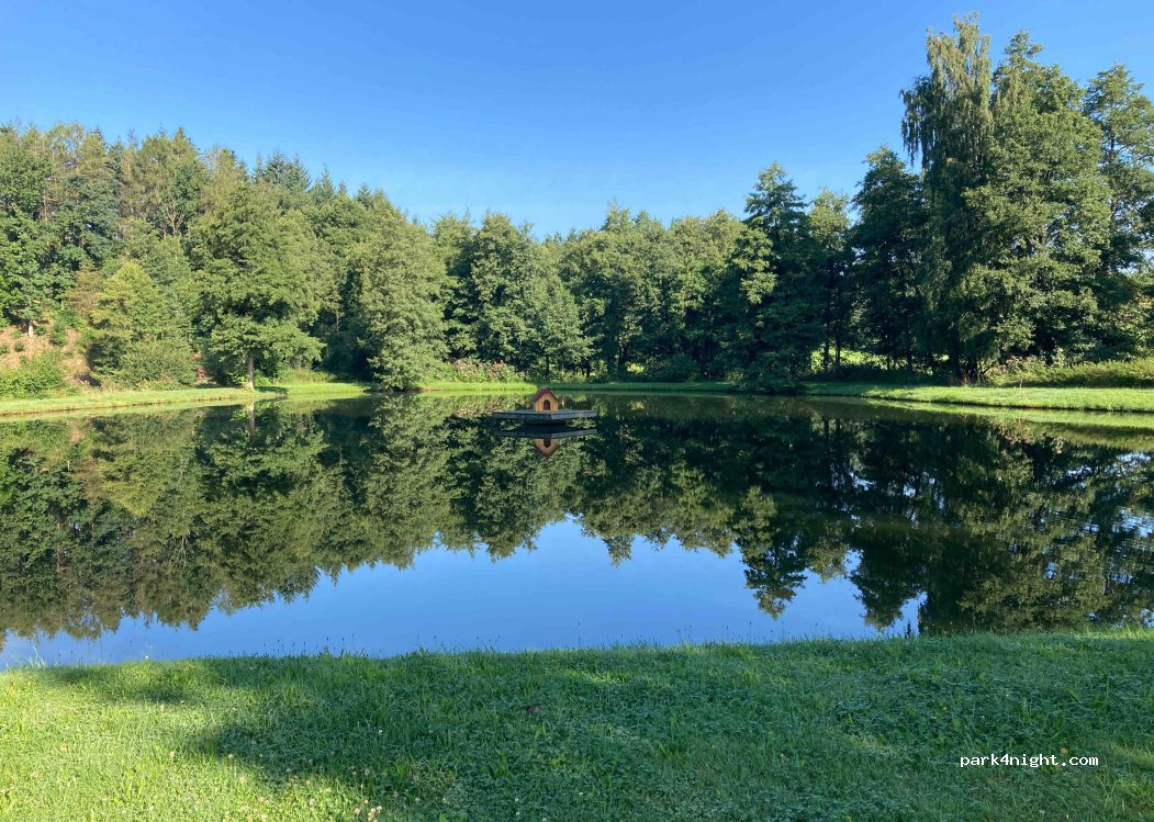 Wunderschöner, recht ruhig gelegener Parkplatz an einem angelegten Entensee. Die Pension „Am Sonnenhang“ bietet eine exzellente Küche. Wir kommen deswegen einmal im Jahr hier vorbei und machen wegen des guten Essens hier eine Übernachtungspause.