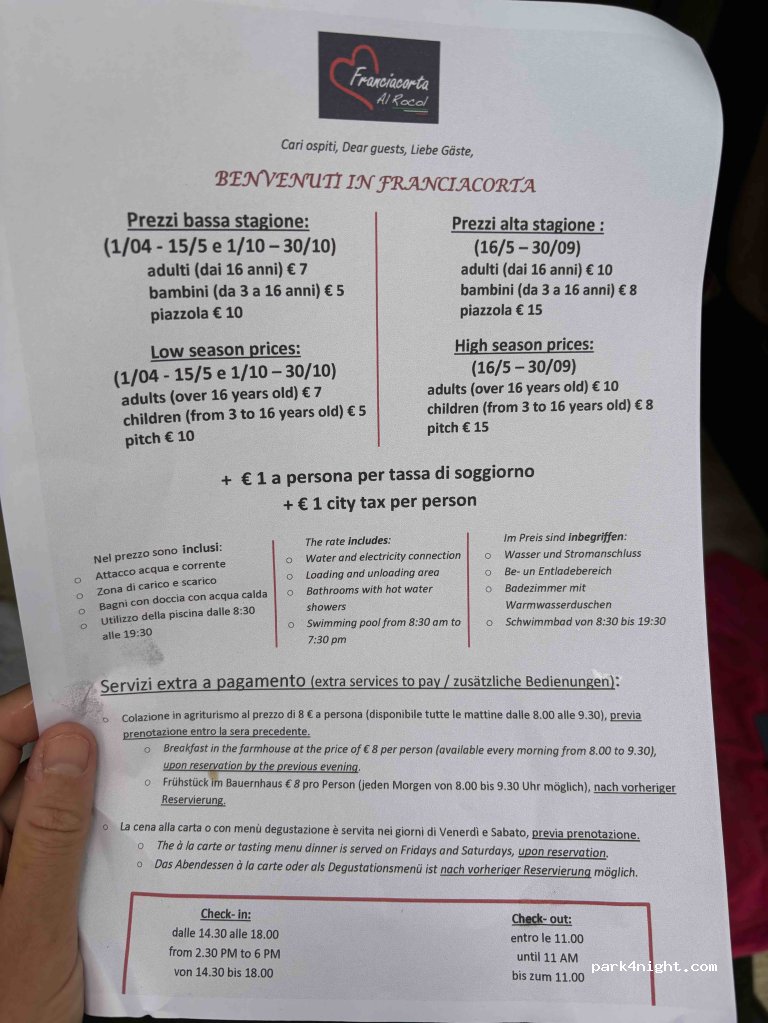 Ganz nett hier, saubere Sanitäranlagen, netter Empfang, guter Wein, Schöner Pool. Nervig waren die Mücken. Der Preis ist auch teurer, wir haben 35€ bezahlt, dafür kann man den Pool aber auch nutzen und Strom ist direkt dabei. 1€ pro Person Kurtaxe. Habe das aktuellste Preisblatt angehängt.