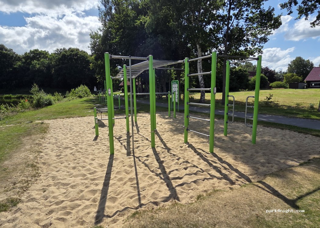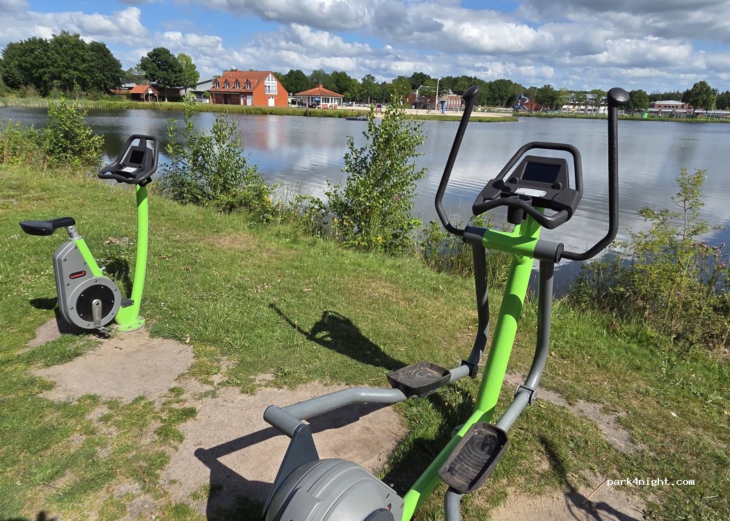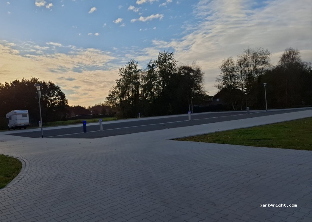 Parking space for mobile homes at the community center with lake and playground. Nice circular route around the lake. Very nice here. Location not entirely flat, trestles recommended.