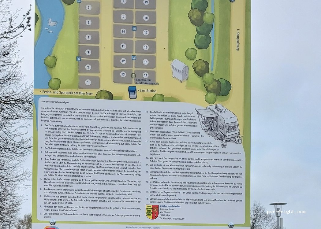 Stellplatz für Wohnmobile am Gemeindezentrum mit See und Spielplatz. Schöner Rundweg um den See. Sehr schön hier. Standort nicht ganz flach, Böcke empfehlenswert.