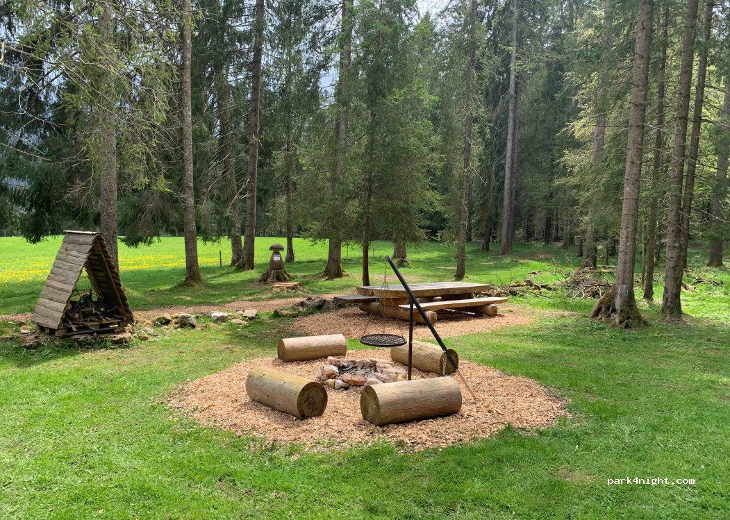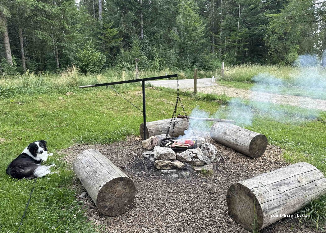 Lieu super bien aménagé avec une grande table en bois, un foyer pour le feu, le tout sous les sapins et à l'orée des champs de foin. Parfait pour se ressourcer une nuit sur les hauts du Val de Travers près de la Côte-aux-Fées.