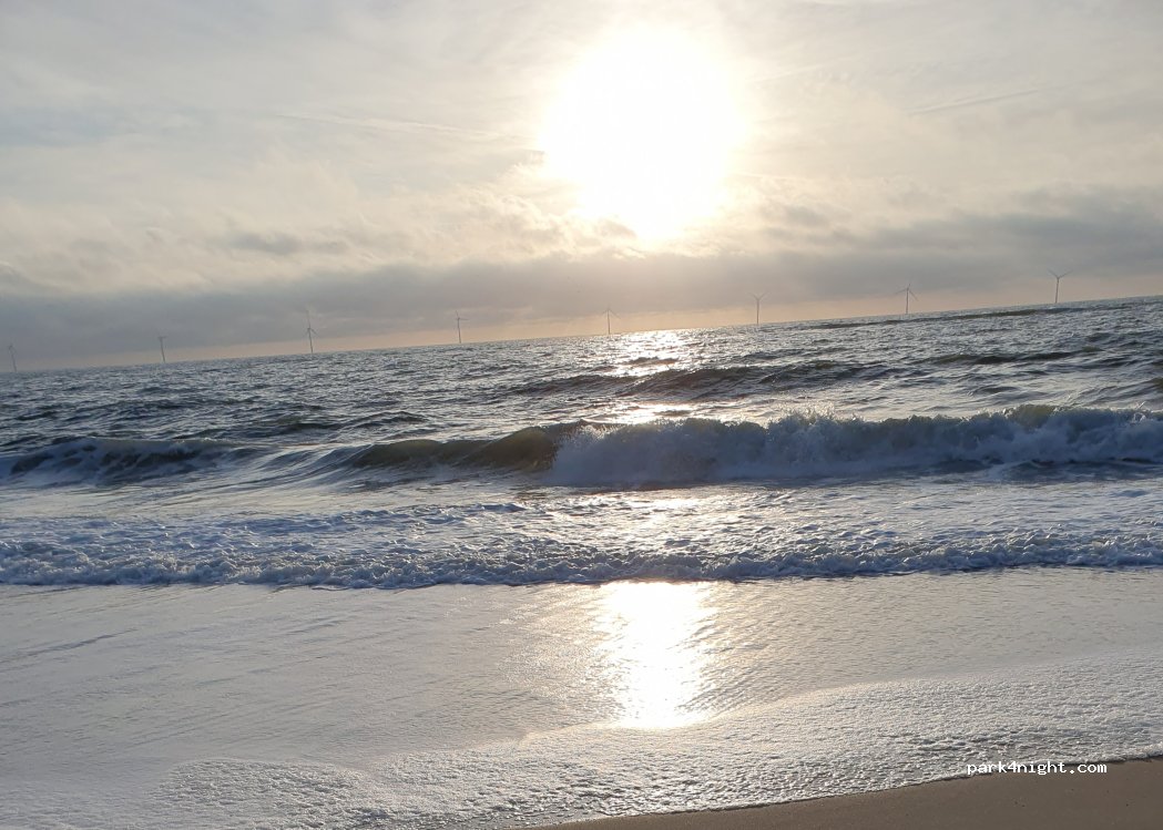 A super spot right by the sea, with some wind protection behind the dunes. As the sun set between the wind turbines on the horizon, the car park emptied, leaving 4 MHs. A couple of tables, benches, bins, and a very clean toilet make this the perfect place for a calm and peaceful evening / night.
