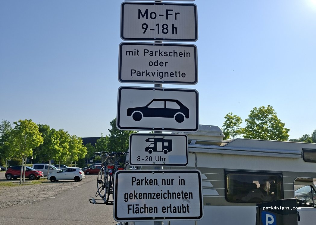 Übernachten verboten (Womos nur zwischen 8-20 Uhr erlaubt). Bis 18 Uhr werden Gebühren erhoben Mo-Fr