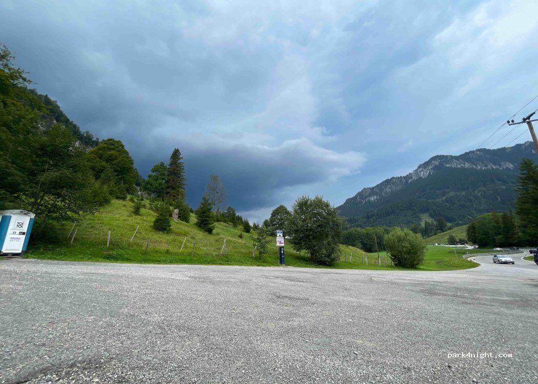 Fortement déconseillé …. C’est en bord de route, très incliné et surtout c’est un parking d’accès à une randonnée. De ce fait, c’est 6h jusque 00h et après il faut repayer 6h !! Je vous conseille d’aller un peu plus haut vers Unter, plus calme, secure et avec vrais wc.