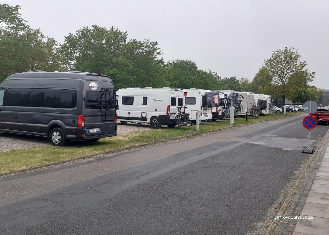 Es ist ein gemischter Parkplatz. Für eine Übernachtung völlig in Ordnung. Nachdem was ich eruiert habe, kostet der Platz kein Geld. Nur wenn man die sanitäre Anlage nützen möchte, muss man am Automat eine Gebühr, ich glaube 50 DKK Pfand, entrichten. Dafür erhält man eine Chipkarte für den Eingang. Die Stadt ist sehenswert, die Streetfoodhalle ist der Hammer.