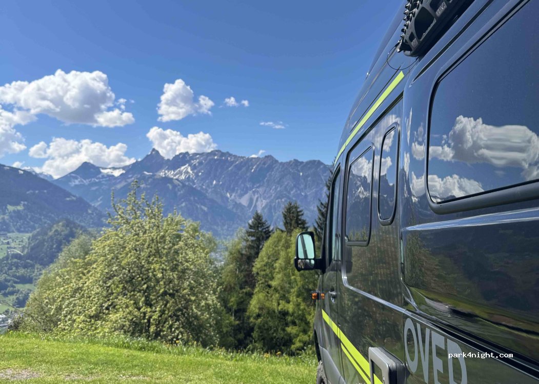 You spend the night next to an old Montafon farmhouse. The parking space is located at 1100m above sea level above Schruns in a unique location. The parking space can be reached via a single-lane mountain road and is therefore not suitable for every motorhome and every driver. For larger mobile homes (max. 6.5m) we recommend arriving via the Hofweg!