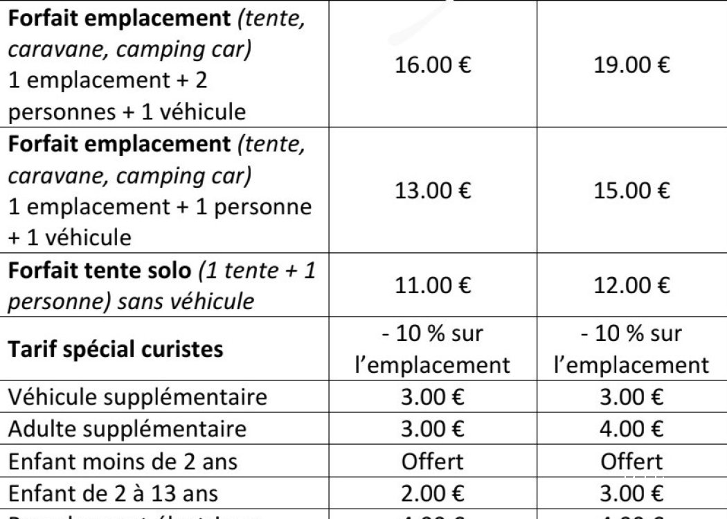 Stationnement camping car à partir de 12 euros en hors saison pour un véhicule et une personne sans électricité - les tarifs sont affichés à l'entrée du camping. Camping avec piscine, possibilités de faire la vidange et le plein en eau.