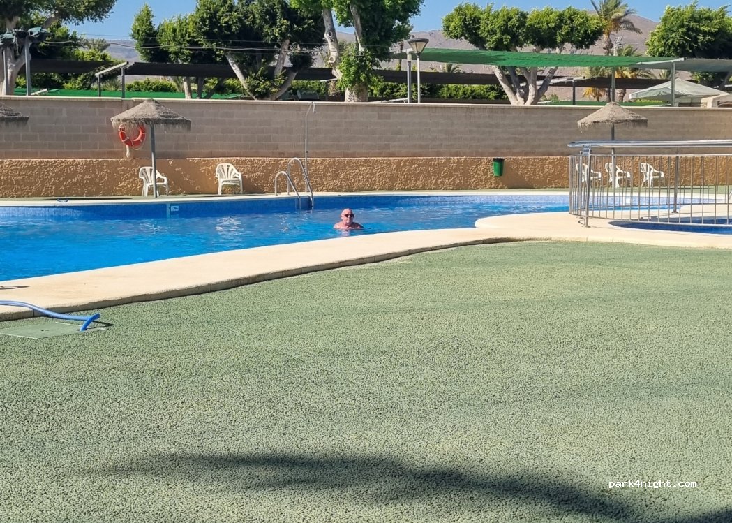 Lugar tranquilo cercano a Almería. Las parcelas un poco pequeñas por el precio que hacen pagar. Tiene piscina y los baños son viejecitos. Una camper, dos personas, 22,90€