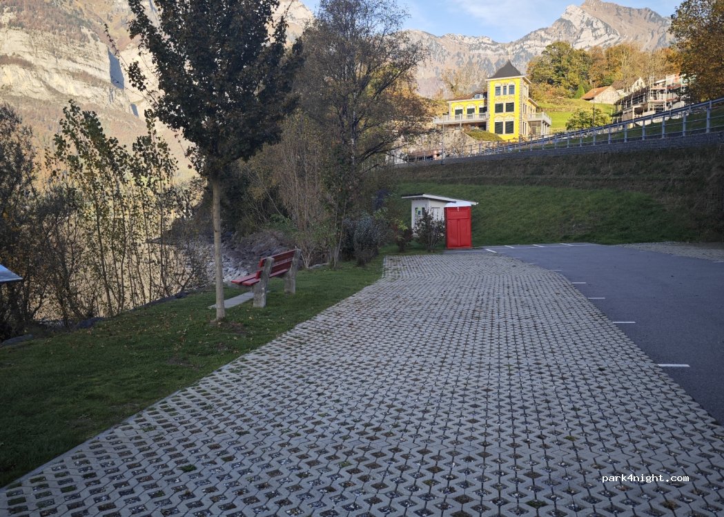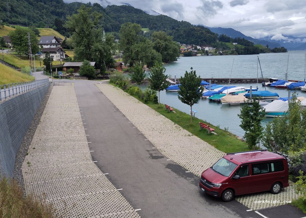 Ein wunderschöner Parkplatz für Tag und Nacht. Fr. 1.- per Stunde 24 Std Fr. 20.- und das ist er wert. Nachts ruhig am Tag fahren Autos oben vorbei. Sauberes Tixi WC. Direkt am Wasser und Aussicht über den See und die Churfirsten Berge. Die Region ist super zum Biken, Wandern, Skifahren. Maximal Fahrzeug 6.40 m alles darüber könnte eng werden.