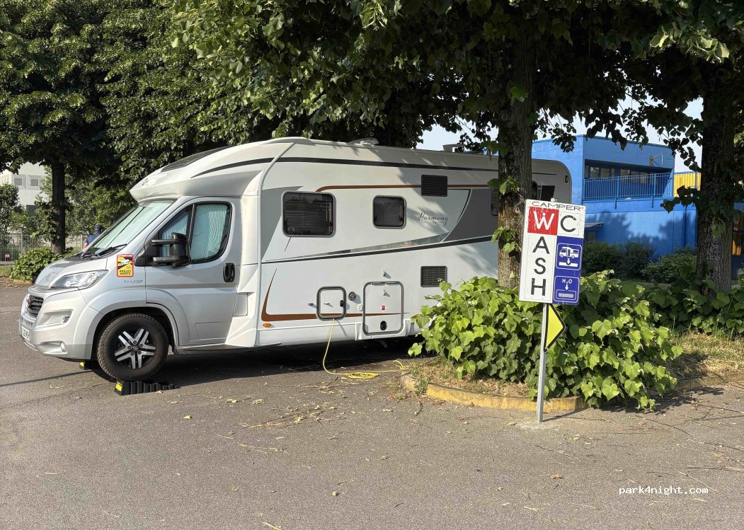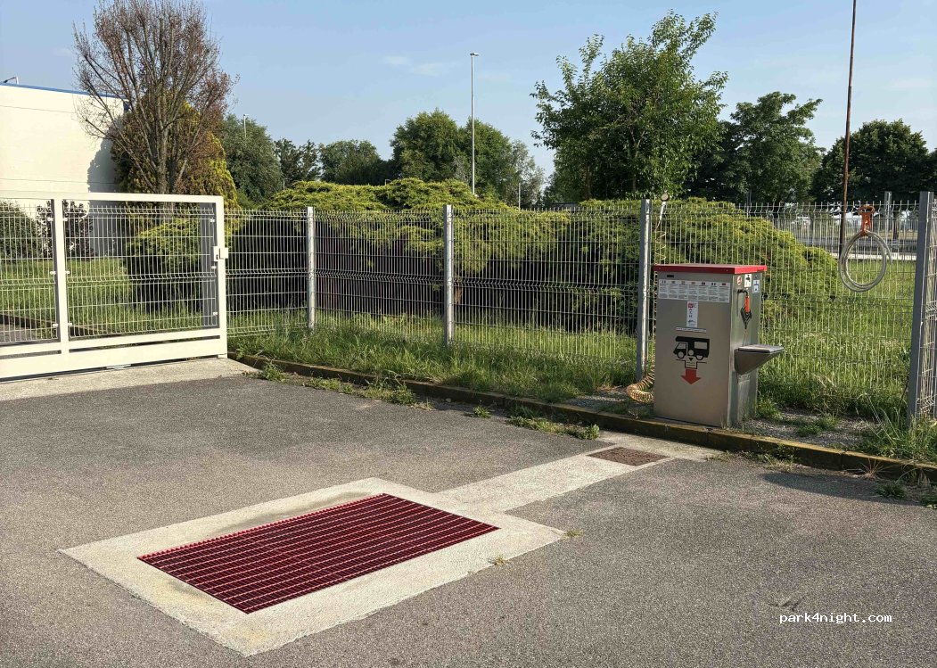 Great stopover in a camper storage centre. Shady park up with electric - very clean service area and basic toilet and shower facilities.nice grassy area for the dogs. The park up is in a secure gated area and the owner gives you an access code. The restaurant next door De Gustibus is great - good value and great food. 20 euros a night