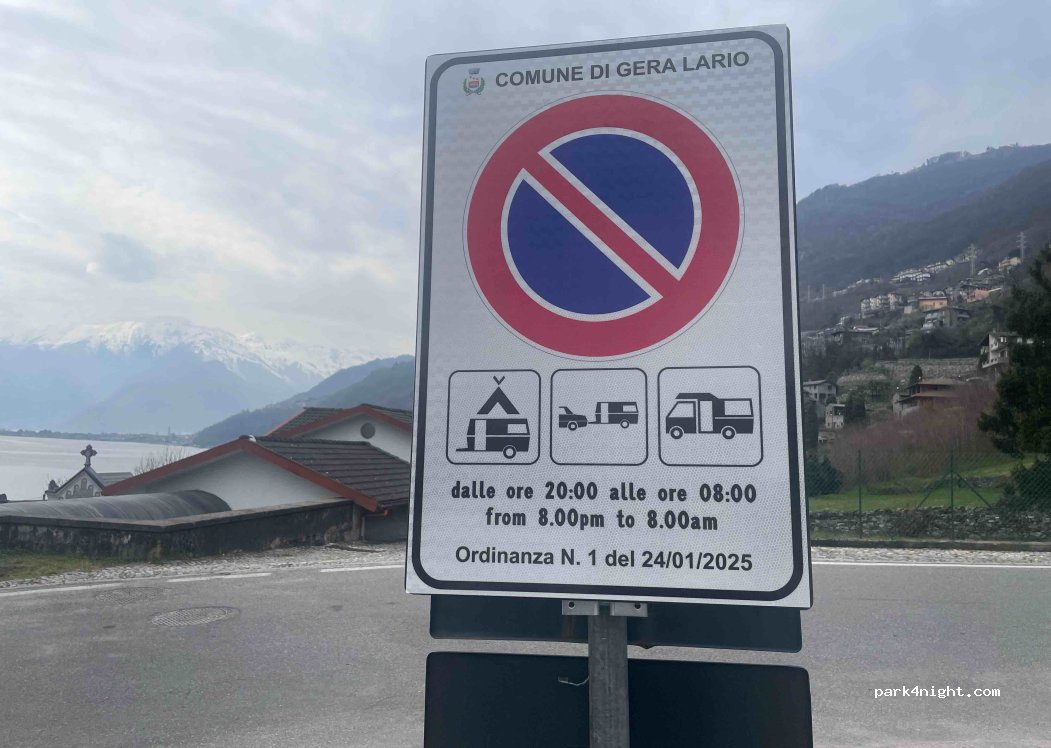 Bel parcheggio con vista lago, cestino e fontanella ma per nuova ordinanza del 24/01/2025 è vietata la sosta a caravan camper e roulotte nelle ore notturne (vedi foto)