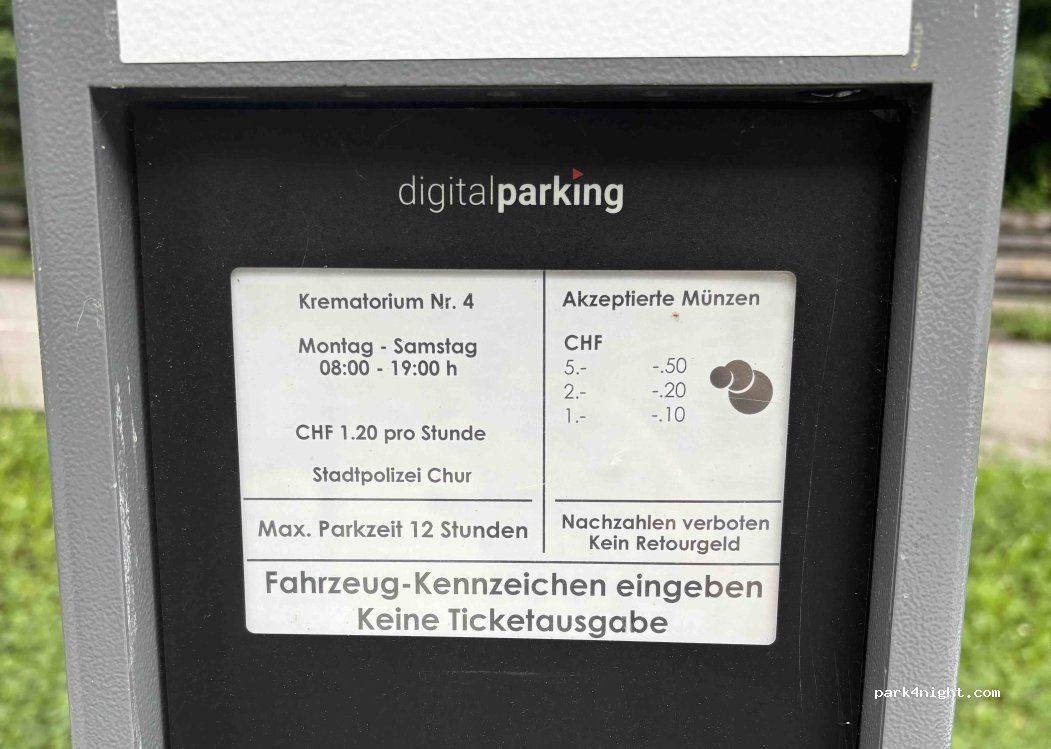 Basta non farsi impressionare dal cartello "Crematorium" posto sul ponticello che porta al parcheggio! il parcheggio è comodo e silenzioso appena fuori Coira, eravamo in due camper, qualche van e anche un paio di macchine. Notte tranquilla, consigliato!